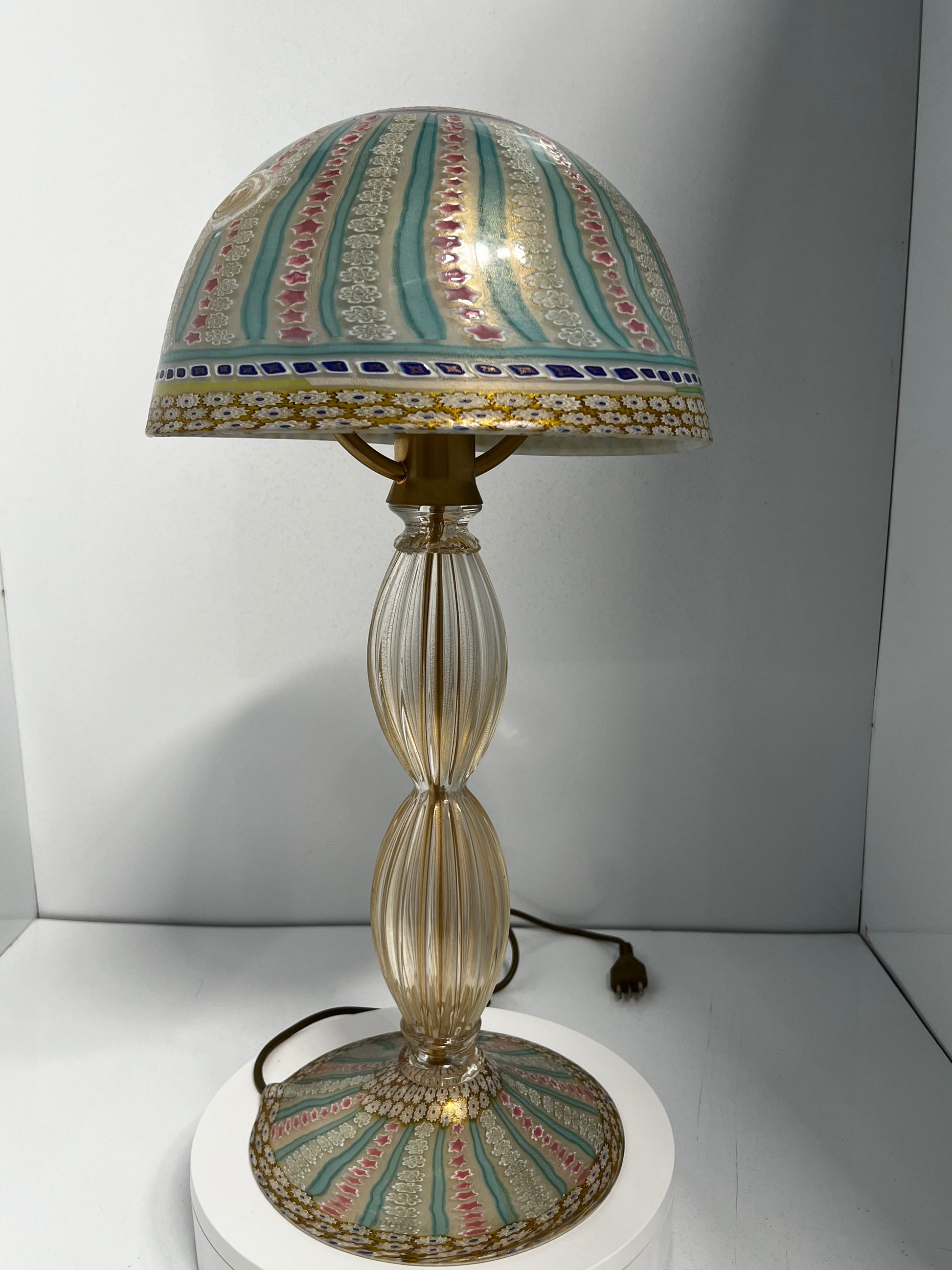 Il punto focale è l'imponente paralume a cupola, che cattura l'attenzione con la sua ricchezza di dettagli e colori. Realizzato con maestria, presenta un motivo floreale stilizzato e geometrico in tonalità di verde tenue, blu e rosso bordeaux, elegantemente delineato da sottili inserti dorati che ne esaltano la luminosità quando la lampada è accesa. La base circolare riprende gli stessi motivi e colori del paralume, creando un'armonia visiva e un senso di continuità nel design.