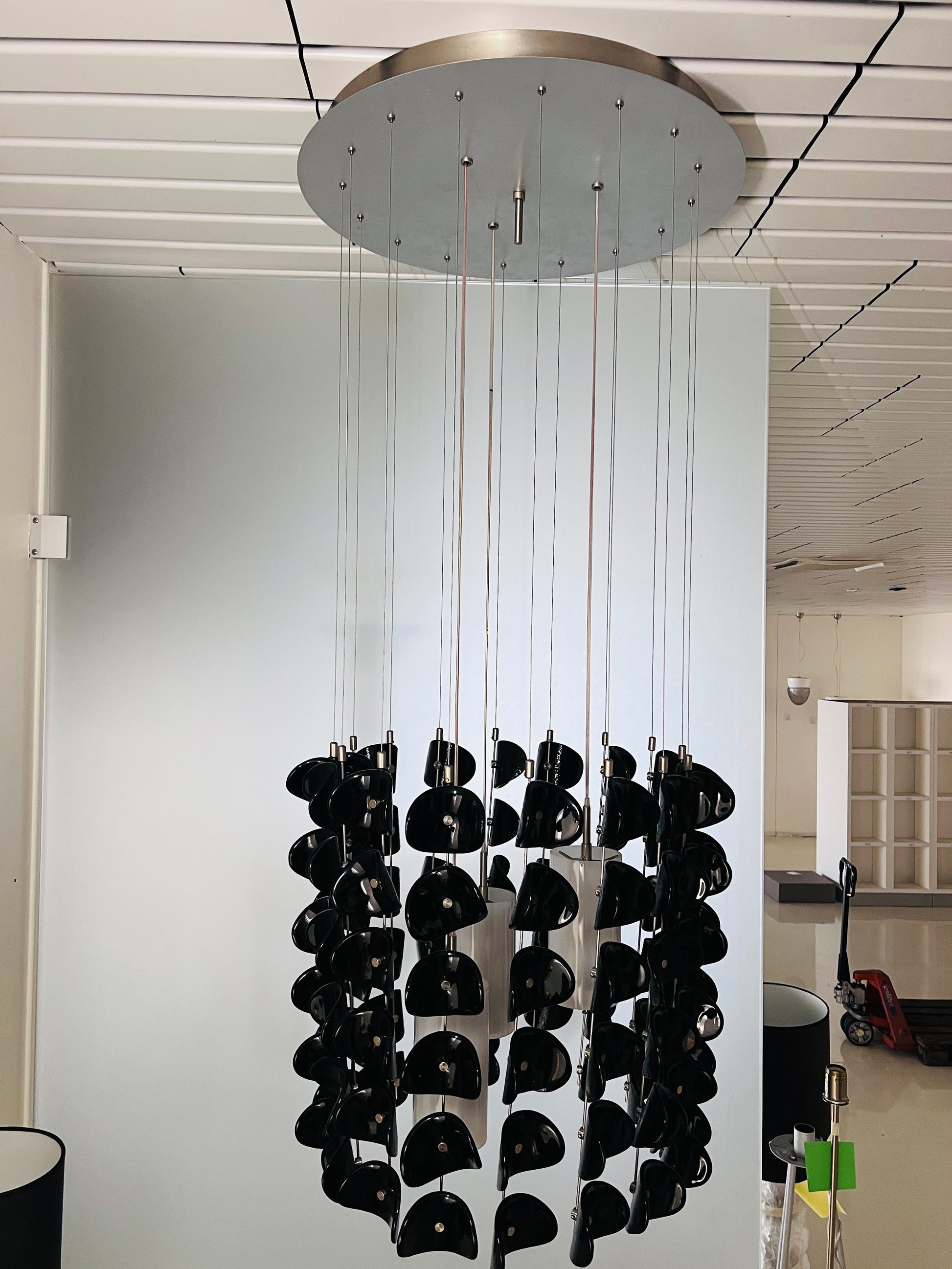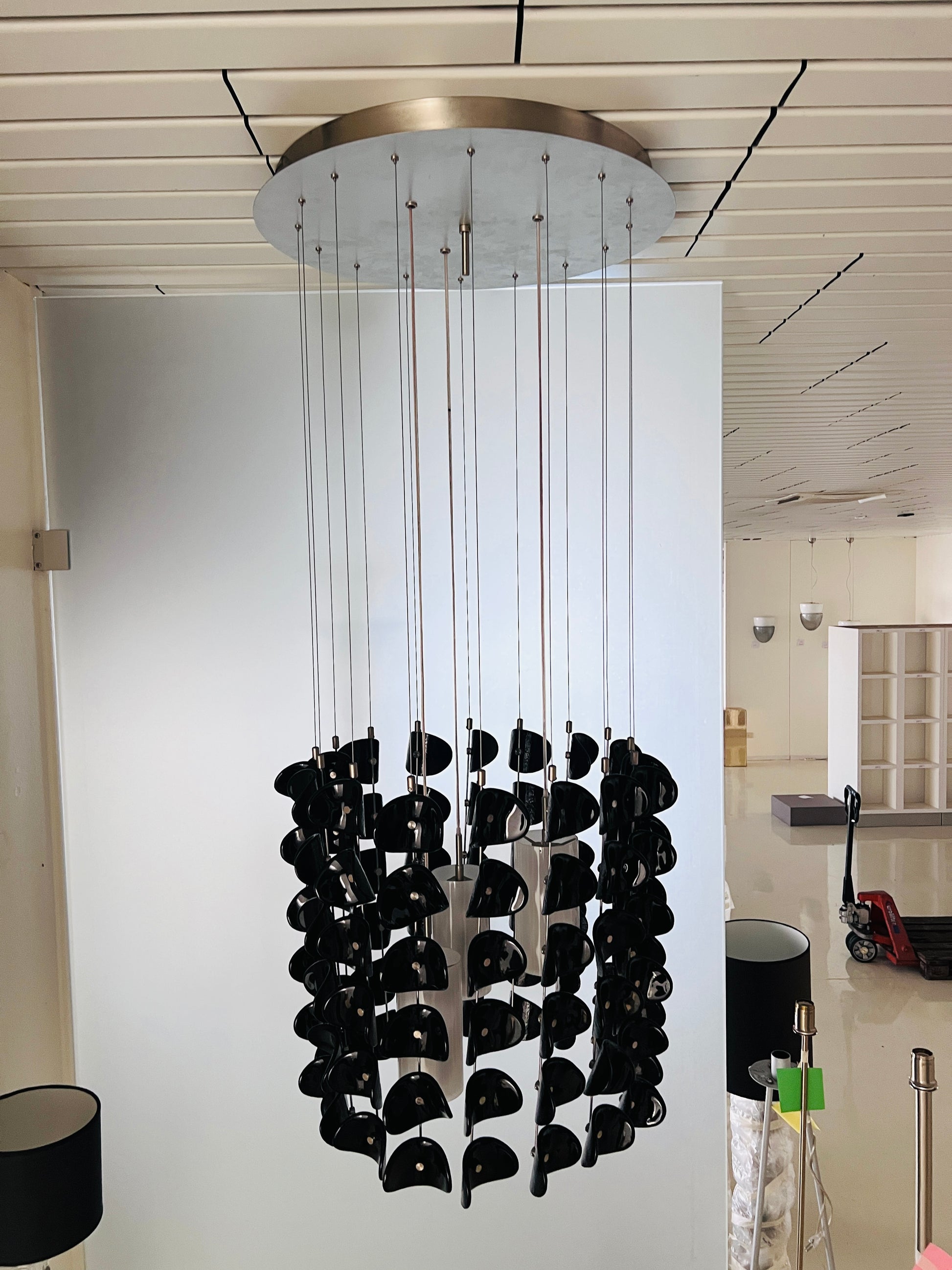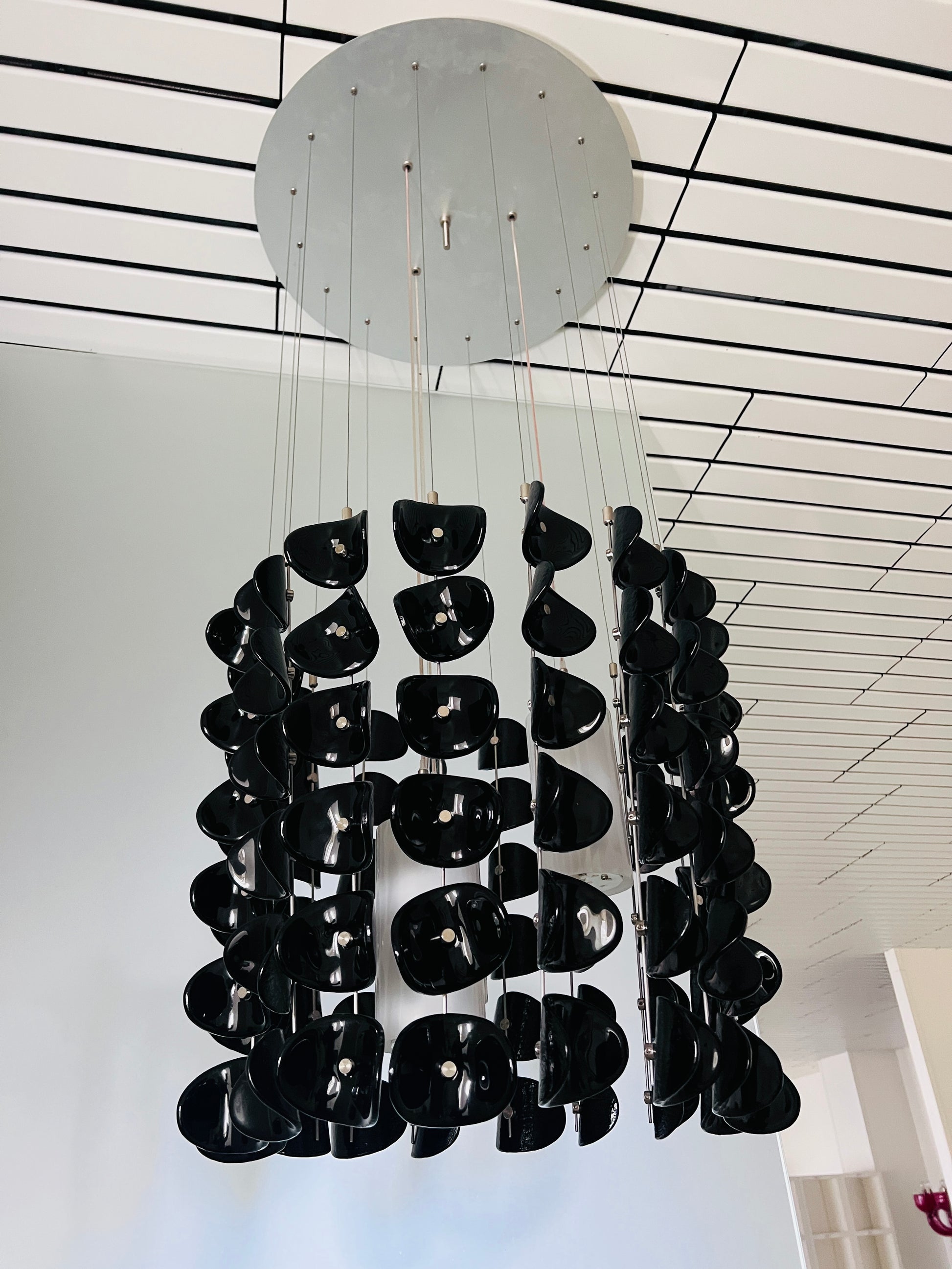 Il Design: Coreografia Sospesa Il cuore di Mariposa è composto da una miriade di elementi concavi in pregiato vetro di Murano nero lucido. Ogni singolo "petalo" di vetro è lavorato a mano e sospeso individualmente tramite sottilissimi cavi d'acciaio che discendono da un rosone minimale al soffitto. Questa struttura aerea crea un volume visivo imponente ma etereo, dove gli elementi sembrano fluttuare nel vuoto.