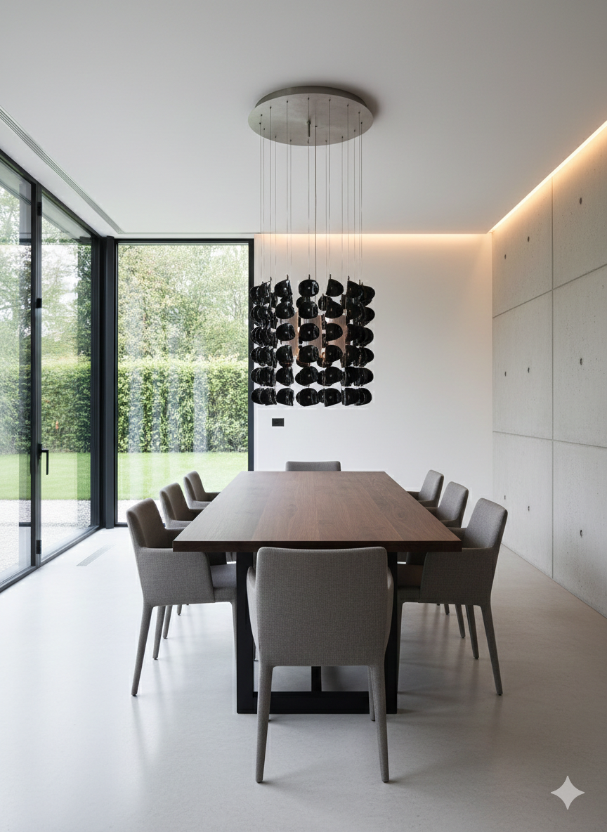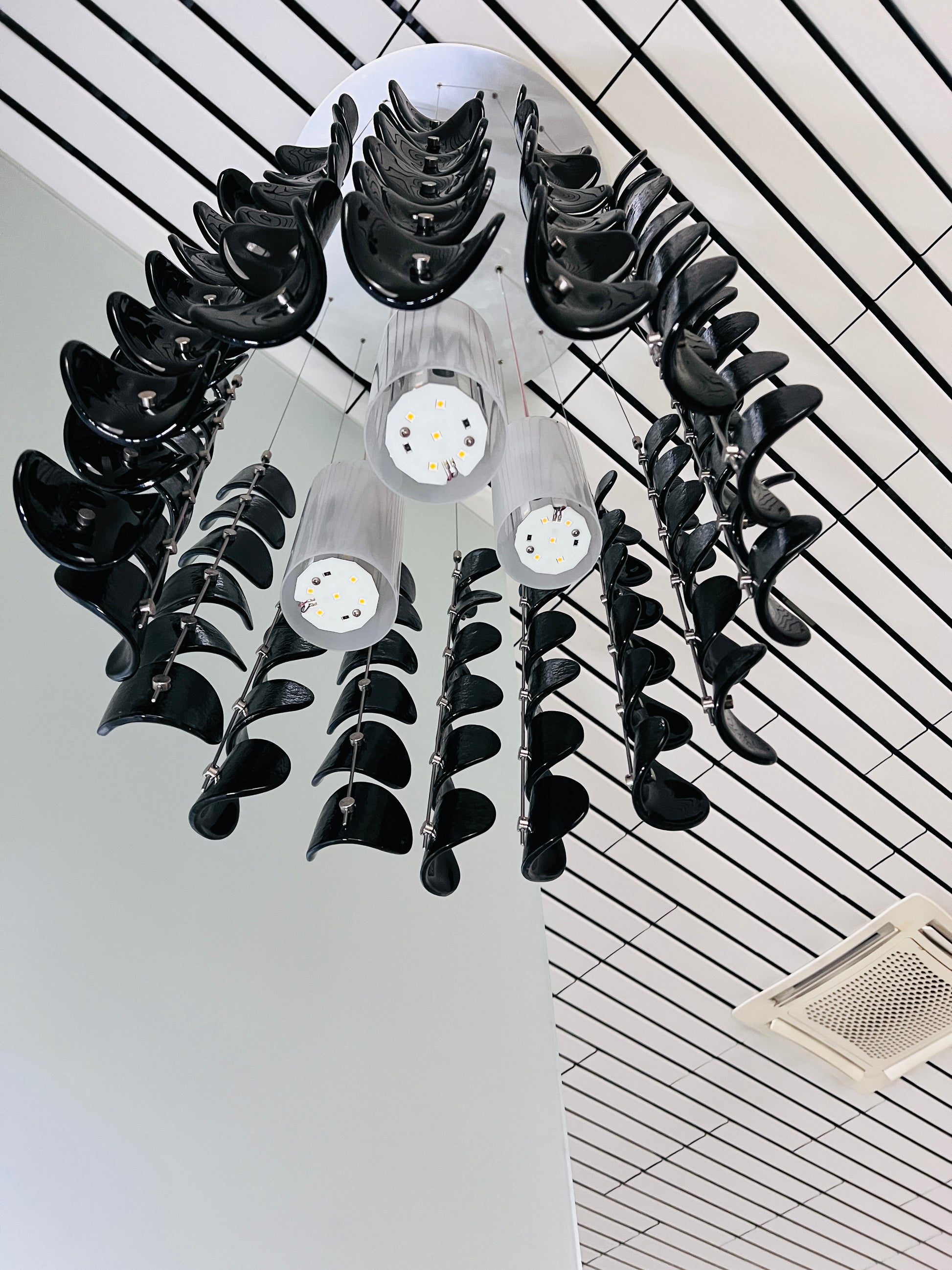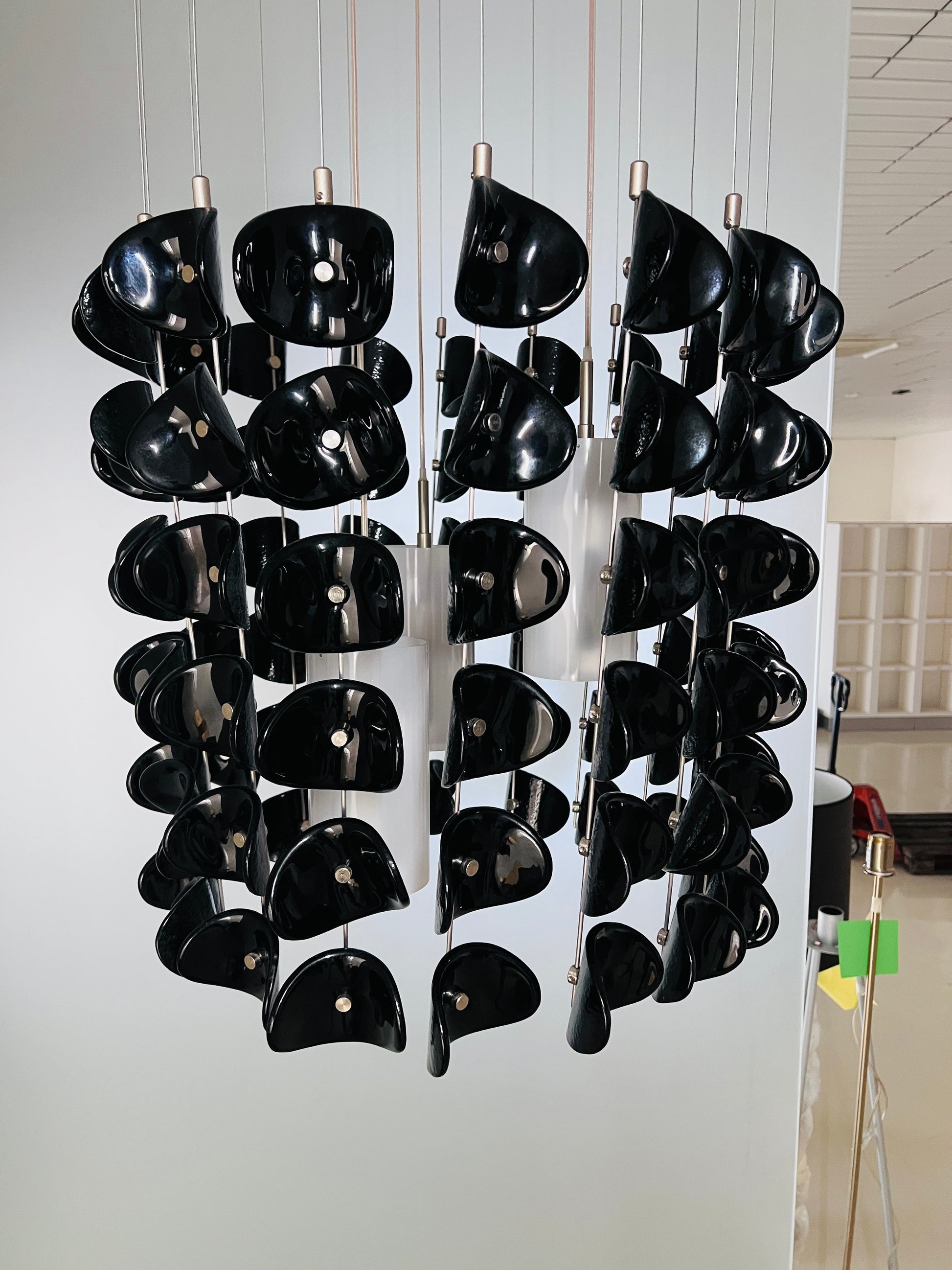 Il Design: Coreografia Sospesa Il cuore di Mariposa è composto da una miriade di elementi concavi in pregiato vetro di Murano nero lucido. Ogni singolo "petalo" di vetro è lavorato a mano e sospeso individualmente tramite sottilissimi cavi d'acciaio che discendono da un rosone minimale al soffitto. Questa struttura aerea crea un volume visivo imponente ma etereo, dove gli elementi sembrano fluttuare nel vuoto.