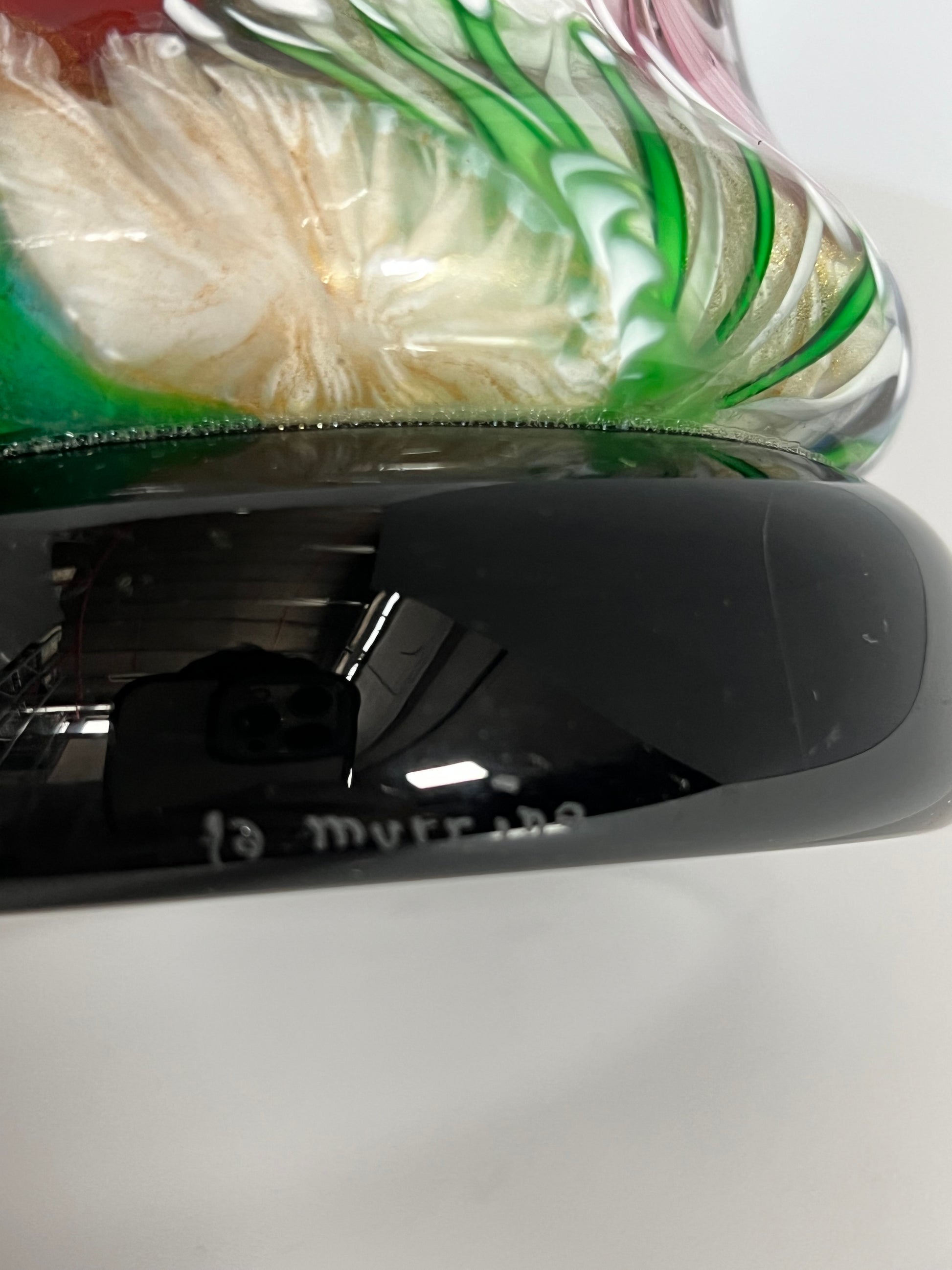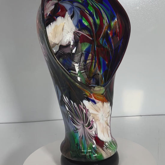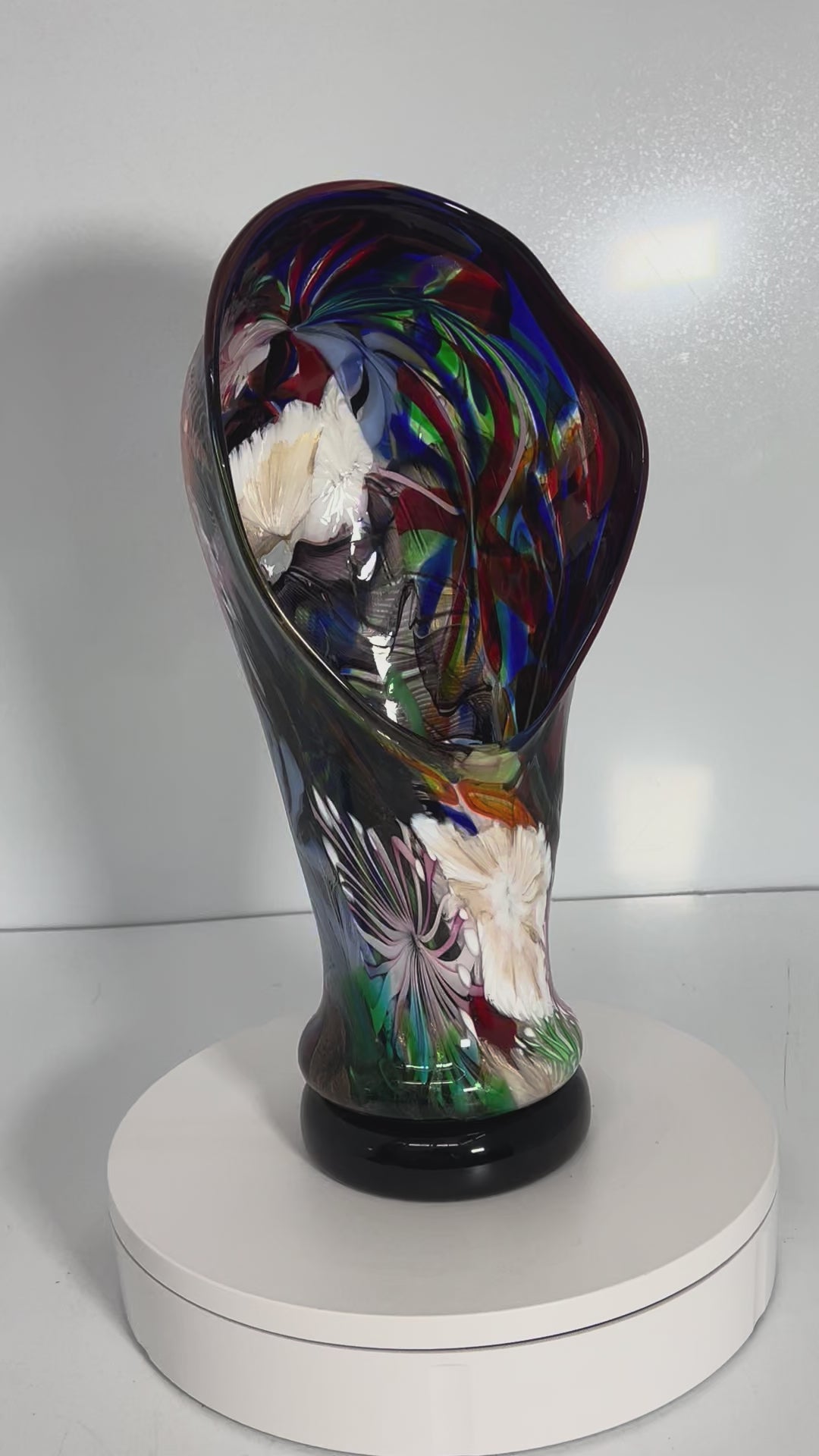 Questo pezzo unico firmato La Murrina non è un semplice contenitore, ma una scultura di luce e vetro che sembra sbocciare come un fiore esotico. Caratterizzato da una silhouette organica e sinuosa, questo pezzo rappresenta l'apice della sperimentazione cromatica veneziana, dove il vetro smette di essere materia e diventa pura emozione visiva.